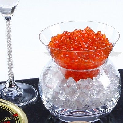 Beautiful glass Caviar serving dish. Fill the bottom glass bowl with ice to keep the Caviar cold. Then fill the top glass with Caviar and serve.